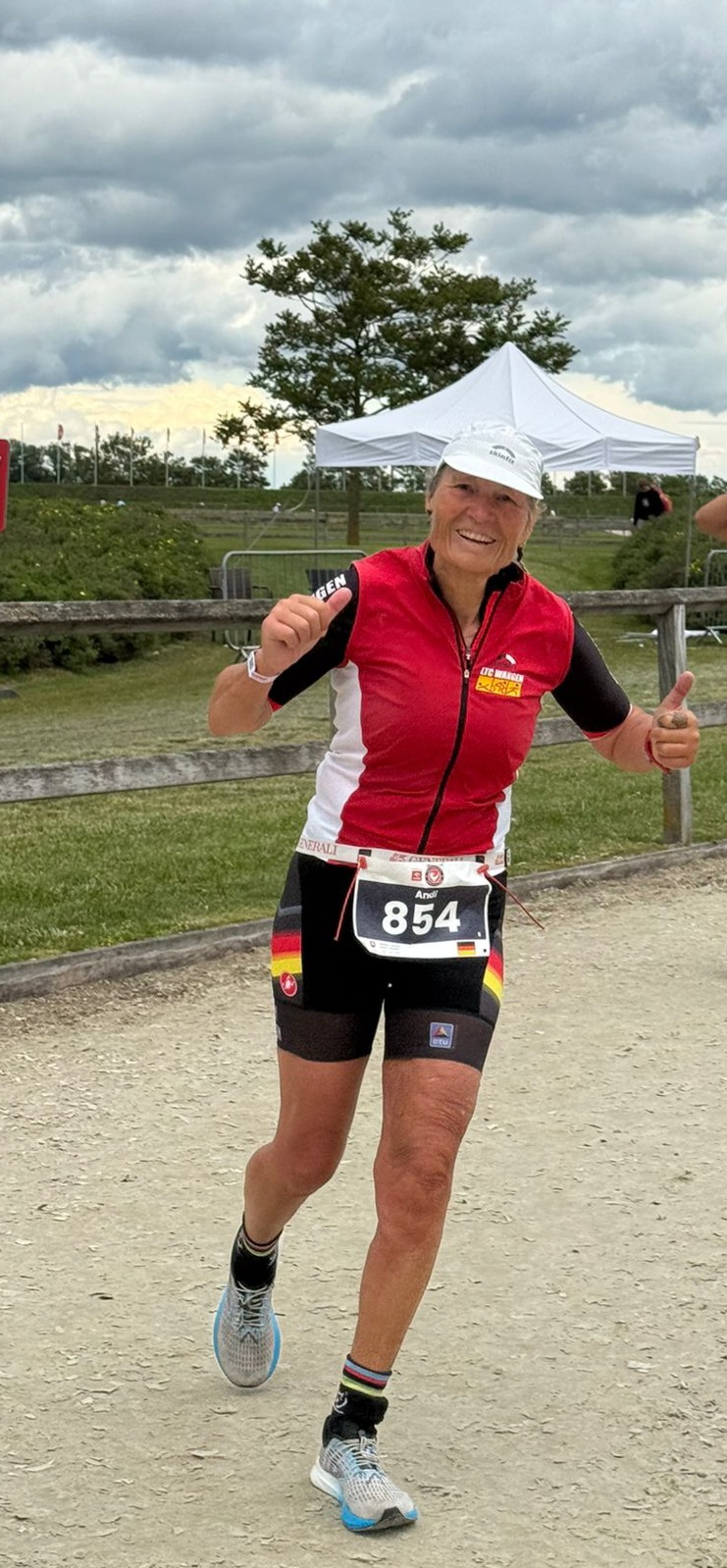 In der Wechselzone verlor sie aber viel Zeit, sie hat sich komplett umgezogen, u.a. auch Regenjacke und lange Handschuhe angezogen, denn es war kalt und es hat geregnet. Die ersten 30km Radfahren dann im Regen. Die Radstrecke war total flach und es war windig. Nach 3:20Std gings dann zum Laufen. Die Laufstrecke war zwar eben, ging aber z.T. über Rasen und große Teile wurden auf den Pferderennbahn auf Sand gelaufen, war nicht so einfach.